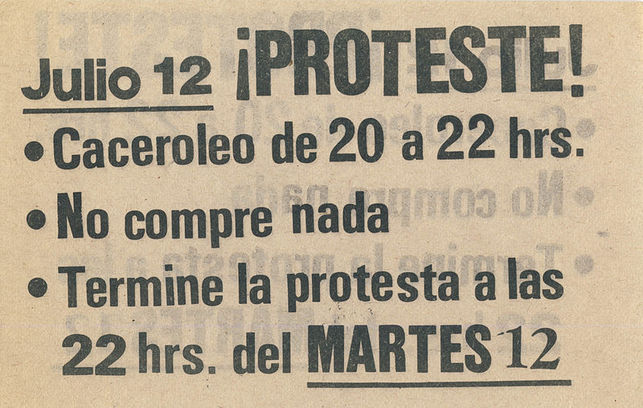Barely a day before the beginning of the strike, the leaders and spokespersons of the worker’s movement decide to change strategies. Rather than having the miners work stoppage be the only means of protest, they called for the first National Day of Protest, with many decentralized actions throughout the country. For example, people were encouraged to drive their cars at a snail´s pace through the main highways and thoroughfares of Chile, creating epic traffic jams all over the country; or to turn the lights on and off in their houses; or to incessantly bang pans and pots at nightfall. This was the birth of the cacerolazo, a mode of protest still very much in use nowadays.