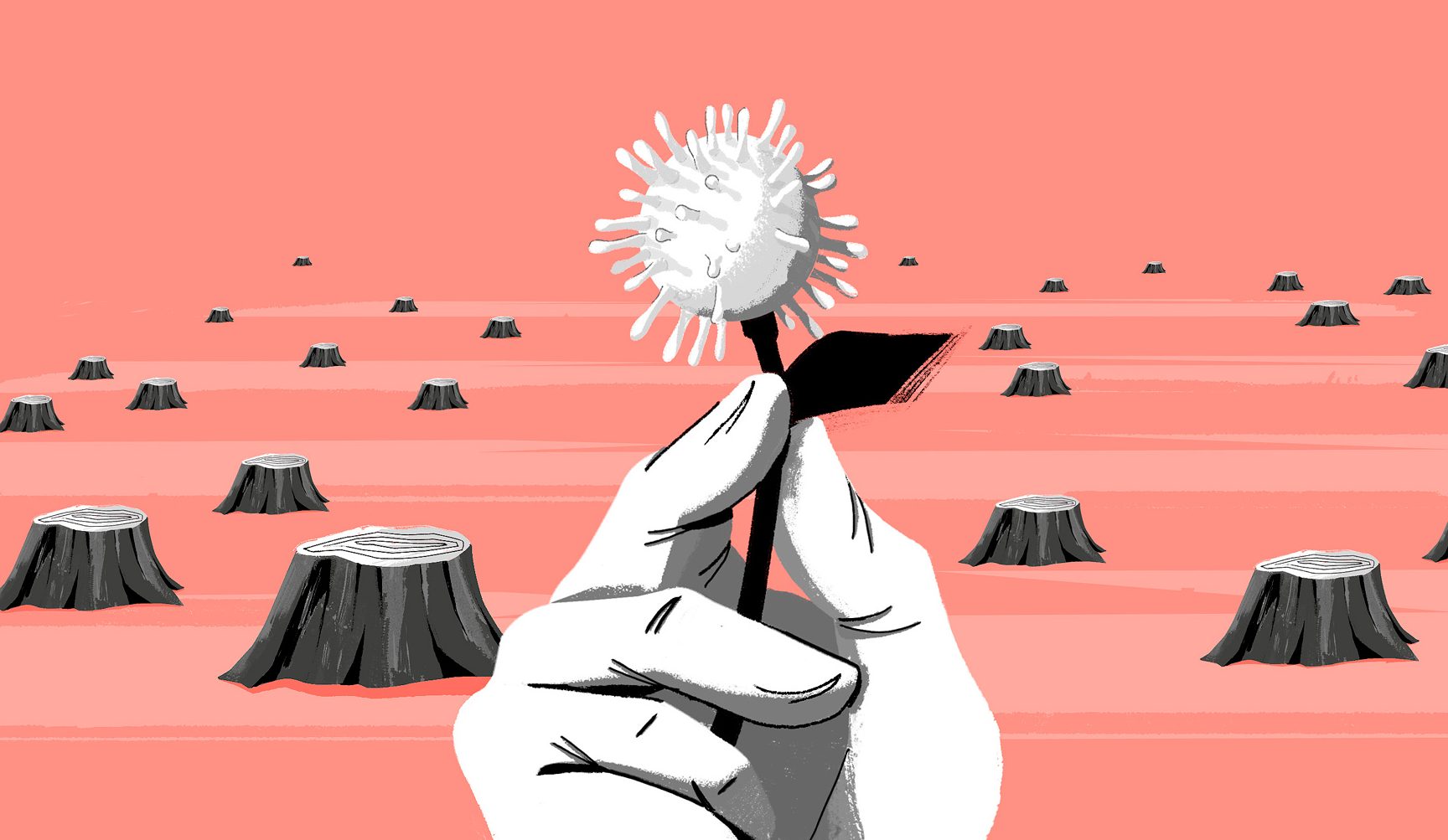 In a report on NPR., Quammen pointed out the fact that humans are the common link in all cases of zoonosis: “We humans are so abundant and so disruptive on this planet. … We’re cutting the tropical forests. […] We’re eating the wildlife. You go into a forest and you shake the trees—literally and figuratively—and viruses fall out.”