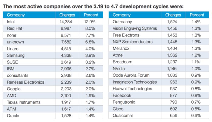 Main contributors to Linux in 2017. Individual volunteer contributors (none) now represent only 7.7% of project participants…