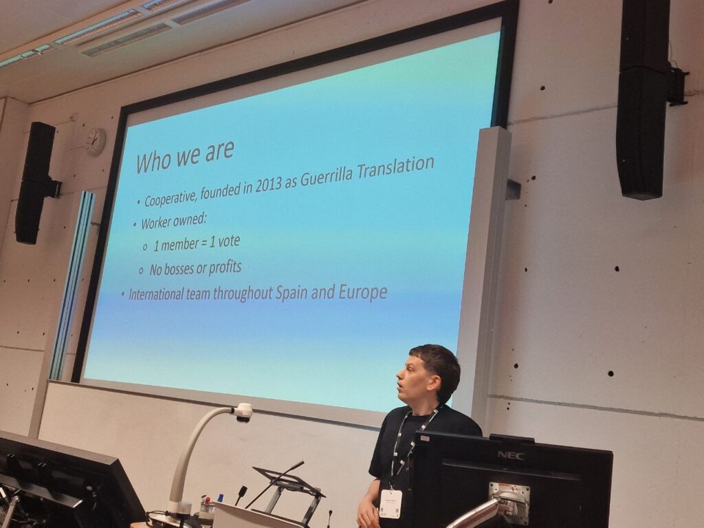 I ended my presentation by pointing out that we would be fools to think a handful of cooperative members can solve the problems making the translation industry, and the world at large, such a precarious, hostile place. However, the value of what we do, both at the EST Congress and every other day, is that we prefigure the world we want to see. We don’t just theorise an alternative way of doing things, we inhabit it. Doing this won’t make the world any less precarious, but it strives towards a system where value is retained in the collective, where resources are distributed fairly among workers, and where care, support and humanity take precedence over profit.