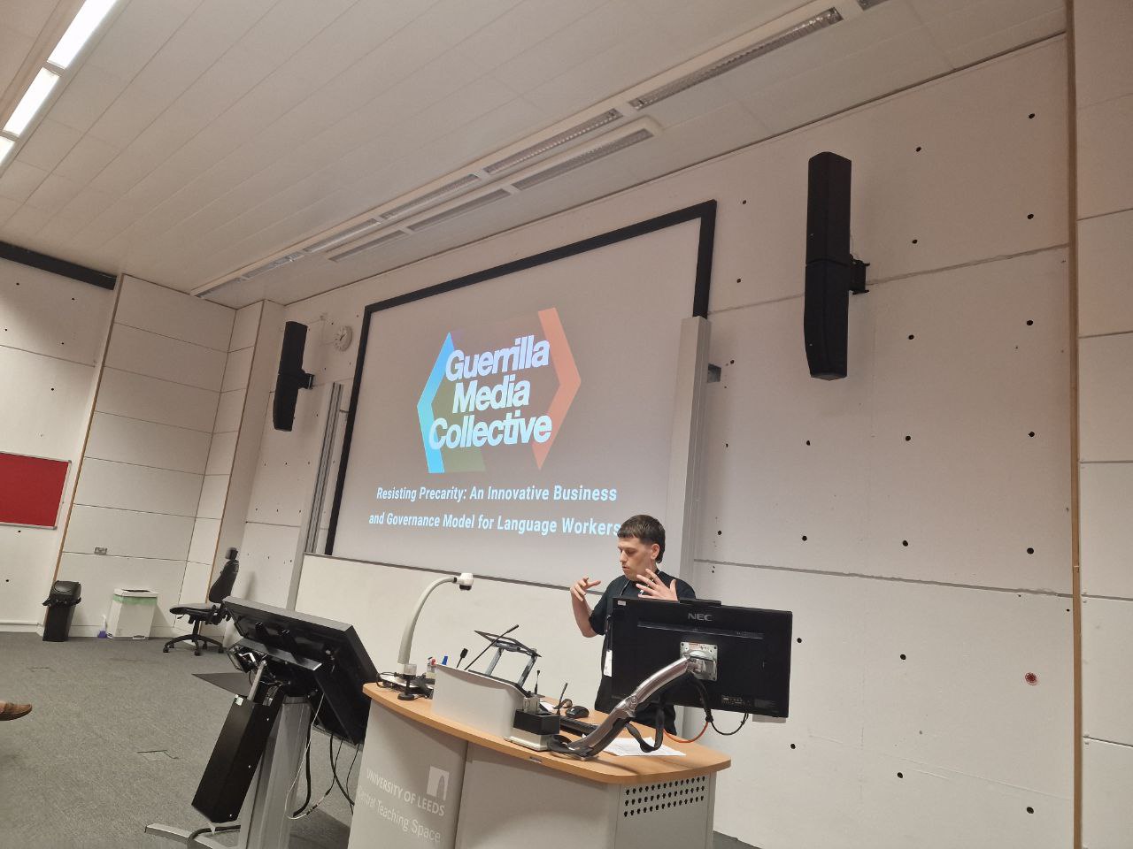 On Wednesday 2 July, I attended the 11th European Society for Translation Studies Congress at the University of Leeds. Academic congresses are not something I’d normally go in for, but in this case I had a reason to be there: I’d been invited to speak on a panel, on behalf of this wonderful cooperative we call Guerrilla Media Collective.