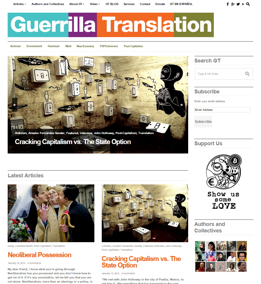 Ultimately, Guerrilla Translation exists for us to share information with our peers worldwide, and to help us all change the dominant narrative of our times, incorporating new stories that carry human and environmentally grounded values. It is our hope that these new websites will help us to continue sharing these stories across nations, cultures and languages. ¡Viva la revolución!