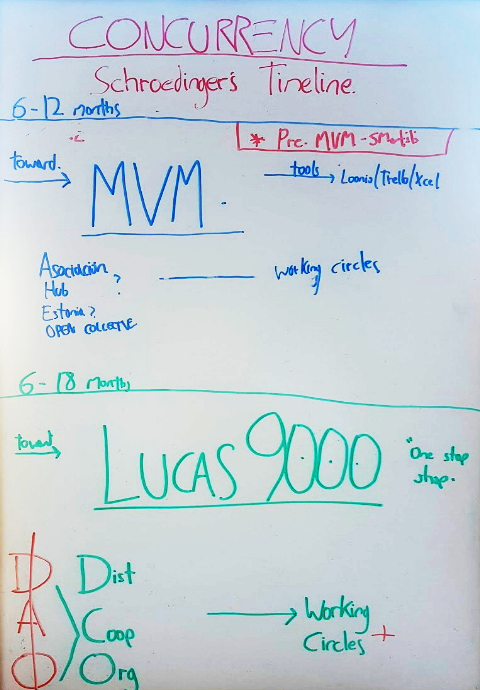 In discussing business structures and priorities, Group 2 emphasized structural flexibility according to the collective’s needs. Concurrency was introduced, a computational principle describing work that happens not only in parallel (people doing different things), but also in different order (not a chain of dependencies). This concept would prove essential in combining both models. 1