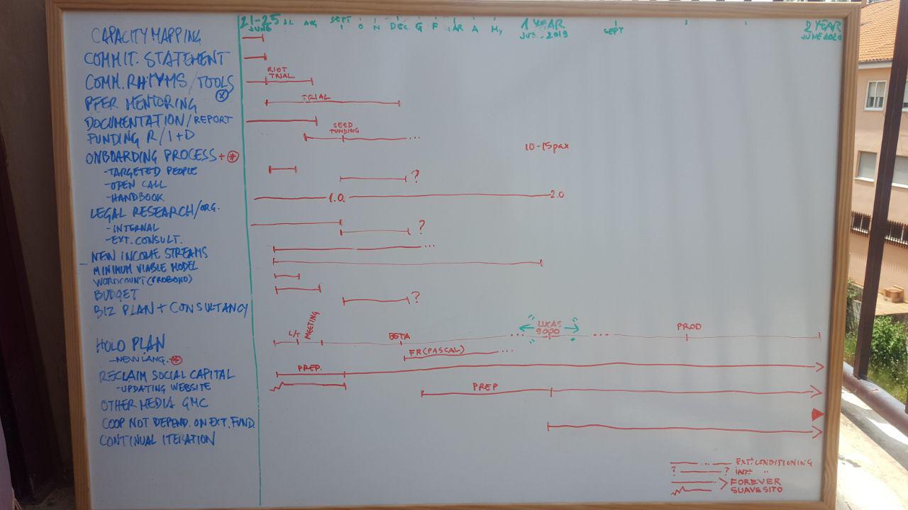 After a review of the prototypes, the team decided to hold a series of thematic conversations to reach agreements in key areas. These included how to bring in new members; our community; communication rhythms and tools; our availability and chosen areas of work; how to track and value carework; ways of mentoring and mutually supporting each other; and how to publicly relaunch the project during September 2018.
