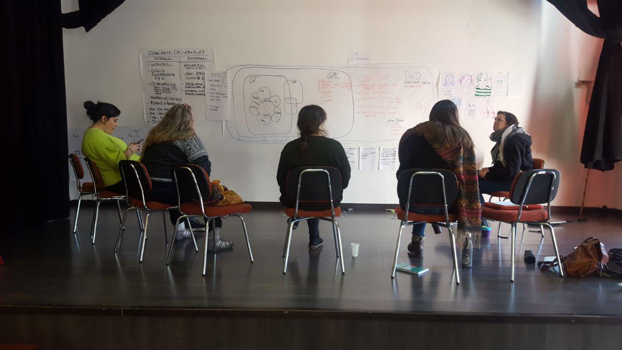 After this, Ann Marie and Stacco, DisCO’s creators, left the space to allow other members to work collaboratively on a creative exercise: create a hypothetical DisCO that fulfills all necessary criteria and present the project as a success story. Together the group came up with a DisCO that used cultural tourism in a rural area to fund local language revitalisation projects and activism. The exercise was immensely helpful and gave everyone a much clearer understanding of the DisCO structure and how Guerrilla Translation, as the DisCO pilot project, relates to the larger mission of developing collective, fair and feminist models of governance for projects oriented towards the common good.