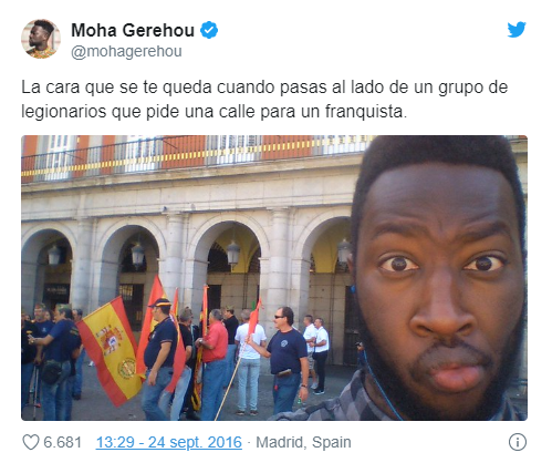 In that same year of 2016, I uploaded a photo to Twitter that sparked quite a controversy on social media. I was on my way to work and while passing through the Plaza Mayor (Madrid), I came upon a rally of veterans with their flags and uniforms, calling for the street to remain named in honor of Millán Astray, an icon of the dictatorship and ideals of Francisco Franco. The Madrid City Council decided to eliminate this military reference in the capital city’s street map, a change that these reactionaries were not going to stand for. When I saw the scene, I took a selfie and uploaded it to Twitter with the caption: “The face you make as you pass a group of veterans calling for a street to be named for a Francoist.”