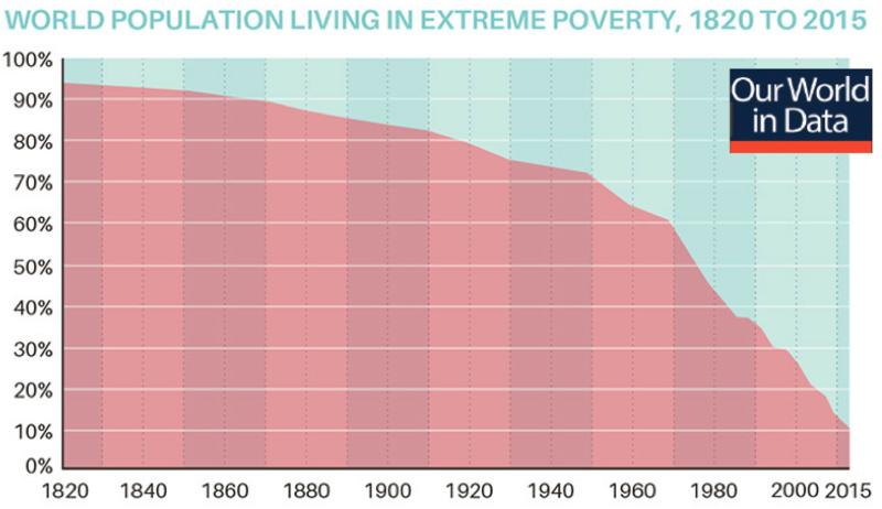 Esta línea argumental se ha repetido hasta la saciedad en los años sucesivos. El psicólogo conservador Jordan Peterson la utilizó en su mediático debate con el filósofo Slavoj Žižek, y Bill Gates la volvió a sacar a colación en 2019, cuando los líderes mundiales y las élites empresariales se reunieron en Davos para celebrar el Foro Económico Mundial. Gates tuiteó un gráfico sobre la pobreza global, creado por Our World in Data, para recordar a sus 46 millones de seguidores que el mundo cada vez mejora más, y para anticiparse a las críticas habituales sobre la desigualdad que siempre surgen en estos eventos en Davos. El gráfico en cuestión mostraba una cuestión sorprendente: la pobreza ha disminuido vertiginosamente durante los últimos 200 años, desde el 94 % de la humanidad en 1820 hasta el 10 % actual (unos 730 millones de personas), experimentando una mejora particularmente rápida desde que empezó la globalización neoliberal en la década de 1980. El mensaje de Gates queda claro: antes de criticar el sistema económico, hay que recordar que ha traído consigo un progreso humano extraordinario.