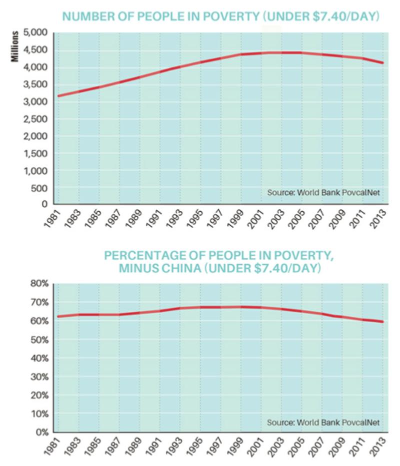 Esos 4200 millones de personas representan el 58% de la población mundial, un porcentaje abrumador. Esta cifra es inferior al 71% de 1981, y sí, el descenso se agradece, pero dista mucho del desplome radical que afirman los nuevos optimistas. En un abrir y cerrar de ojos, la grandiosa historia sobre el progreso parece tenue, mediocre y completamente inaceptable en un mundo tan rico como el nuestro. Es más, la inmensa mayoría de los avances alcanzados en este periodo provienen de una región: China y los tigres de Asia Oriental. Aun dejando a China fuera de la ecuación, la proporción de personas en situación de pobreza hoy en día sigue siendo casi la misma que en 1981, lo que supone que no se ha progresado para nada.
