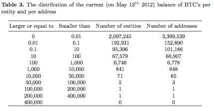 Tabla 3. Distribución actual (13 de Mayo, 2012) del balance de Bitcoins por entidad y por dirección