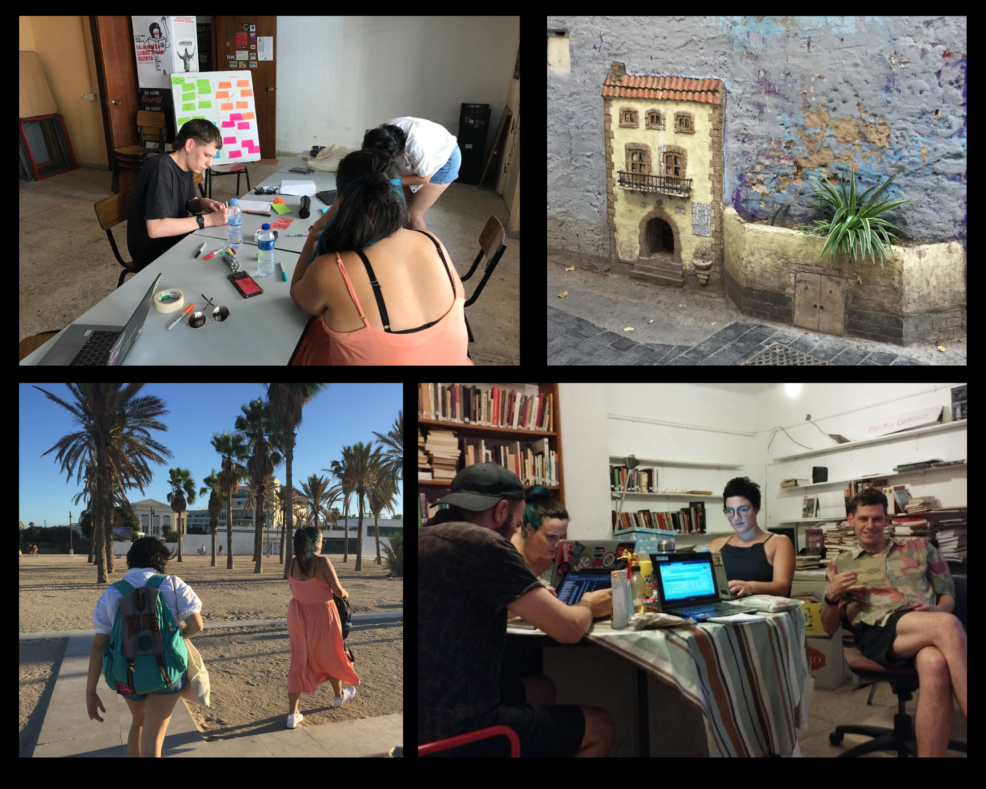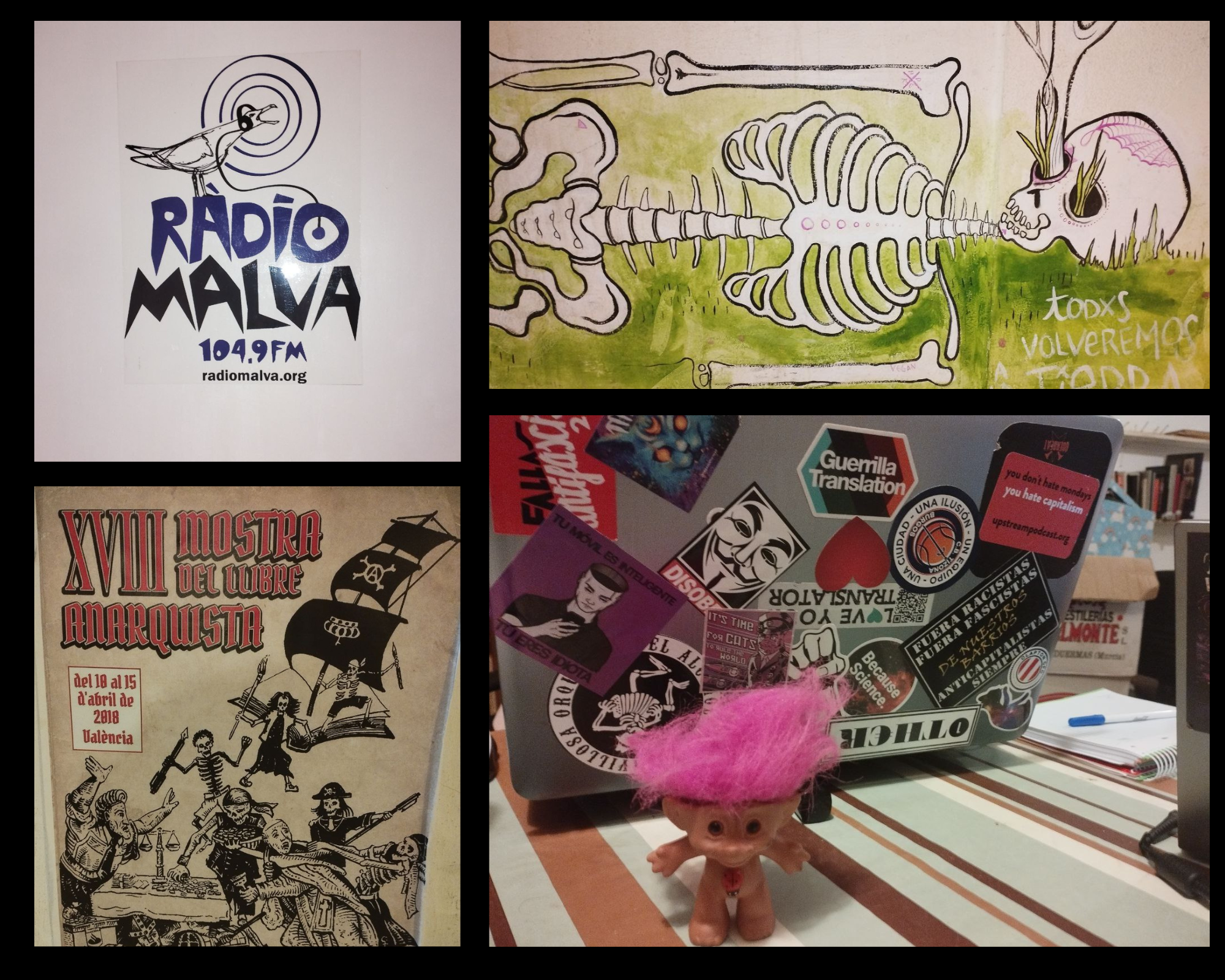 El jueves por la mañana (no muy temprano) nos dirigimos al que sería nuestro centro de operaciones, el Ateneu Llibertari del Cabanyal, un espacio autogestionado y muy gamberro que sus usuaries nos prestaron sin dilación. También es hogar y sede de Radio Malva, una emisora horizontal y asamblearia, no comercial y, sobre todo, desobediente. Una vez asentades en la que sería nuestra guarida durante los siguientes tres días, abrimos la primera sesión de trabajo con una pregunta tan estimulante como peculiar: ¿Cuáles son nuestras esperanzas y deseos de cara a estos días de reunión, tanto en el plano real como en una dimensión alternativa y bizarra?